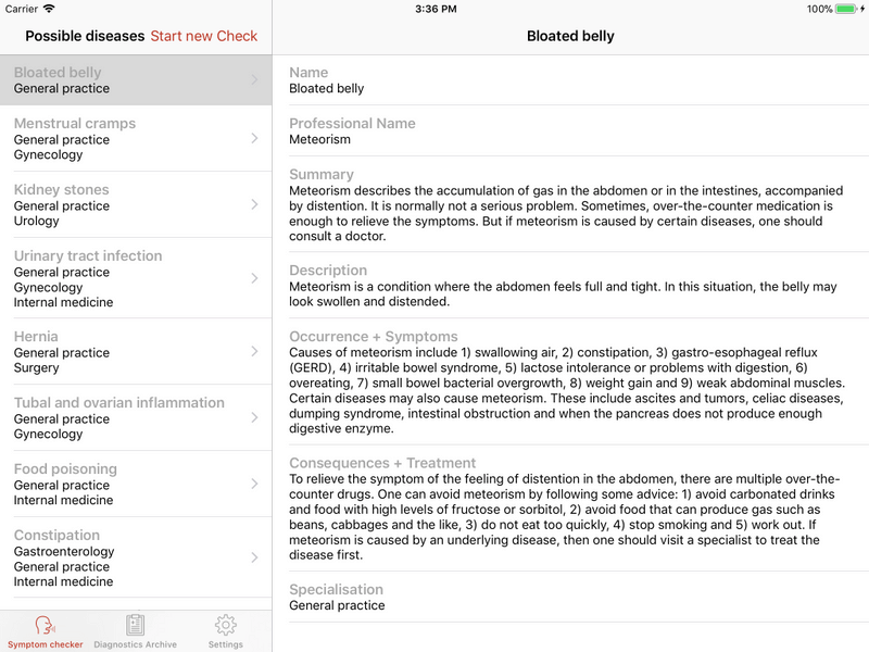 Full featured search over all available symptoms. After select all your health problems, you ca review your selection before analyse your symptoms.