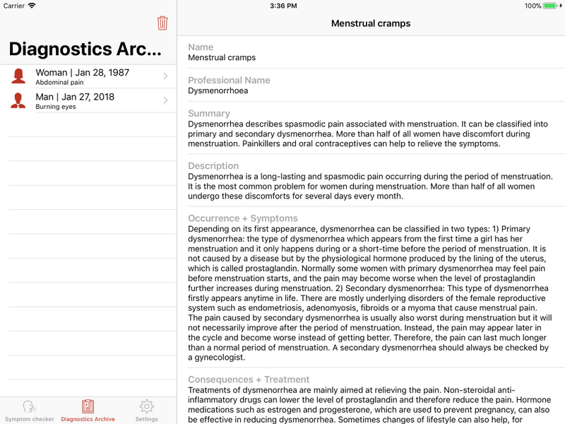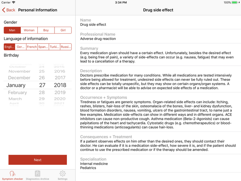 From your personal informations like age, gender ( 👩🏻 woman, 👨🏽 man, 🧒🏿 girl, 👦🏽 boy), and symptoms you have, Dockti Symptom Checker tells you solid results and directs you to more medical information and shows you the right doctor for further clarifications.
